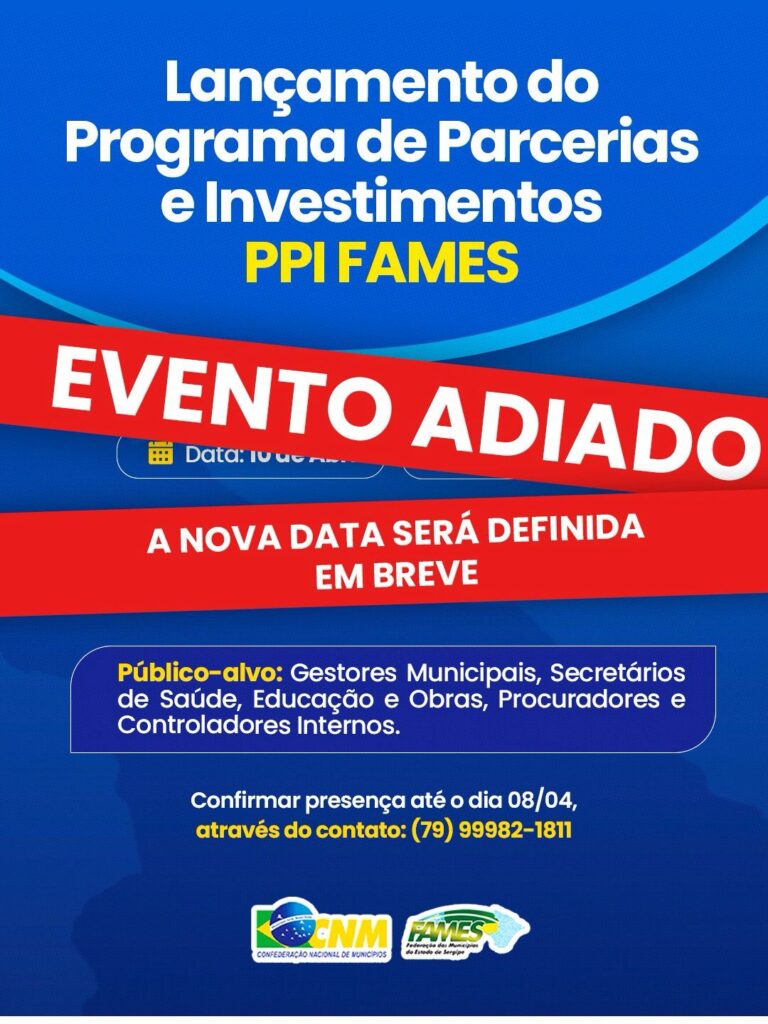 A Federação dos Municípios do Estado de Sergipe (FAMES) informa que o lançamento do Programa de Parcerias e Investimentos (PPI FAMES), que aconteceria nesta sexta-feira, 10 de abril, foi adiado. A nova data para realização do evento será em breve divulgada.