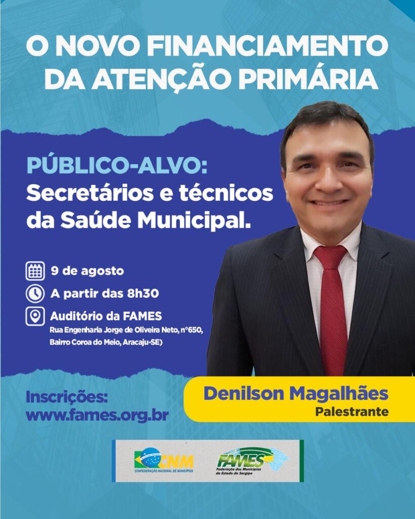 A Federação dos Municípios do Estado de Sergipe (FAMES) convida todos os secretários municipais da Saúde para o evento que será realizado no dia 9 de agosto. O tema em destaque será o “novo financiamento da atenção primária”, com uma palestra ministrada por Denilson Magalhães.
